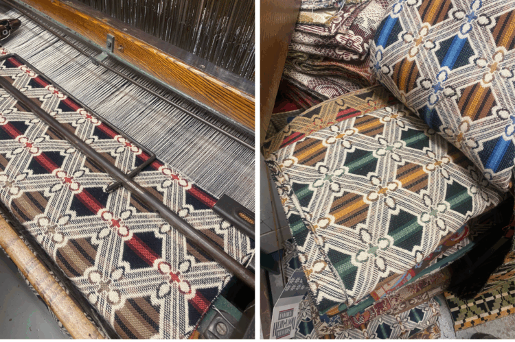 March 2025: Our team made a site visit to Family Heirloom Weavers in Pennsylvania, one the last surviving U.S. textile mills crafting period carpets and textiles for museums, private homes, TV and movie production, and more. FHW has crafted several reproduction carpets for Boscobel including a custom pattern replicating a c.1810 fragment found in the House that can now be seen in museums and private homes across the country. Visiting their site allowed us to see their process and explore other period New York patterns as we look ahead to the future of Boscobel.